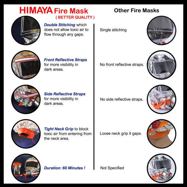 After 2 Red Plugs are pulled and the filter begins to purify the toxic air that you inhale. HIMAYA Fire Mask also has an added feature of reflective straps which are very useful to be seen in the dark.